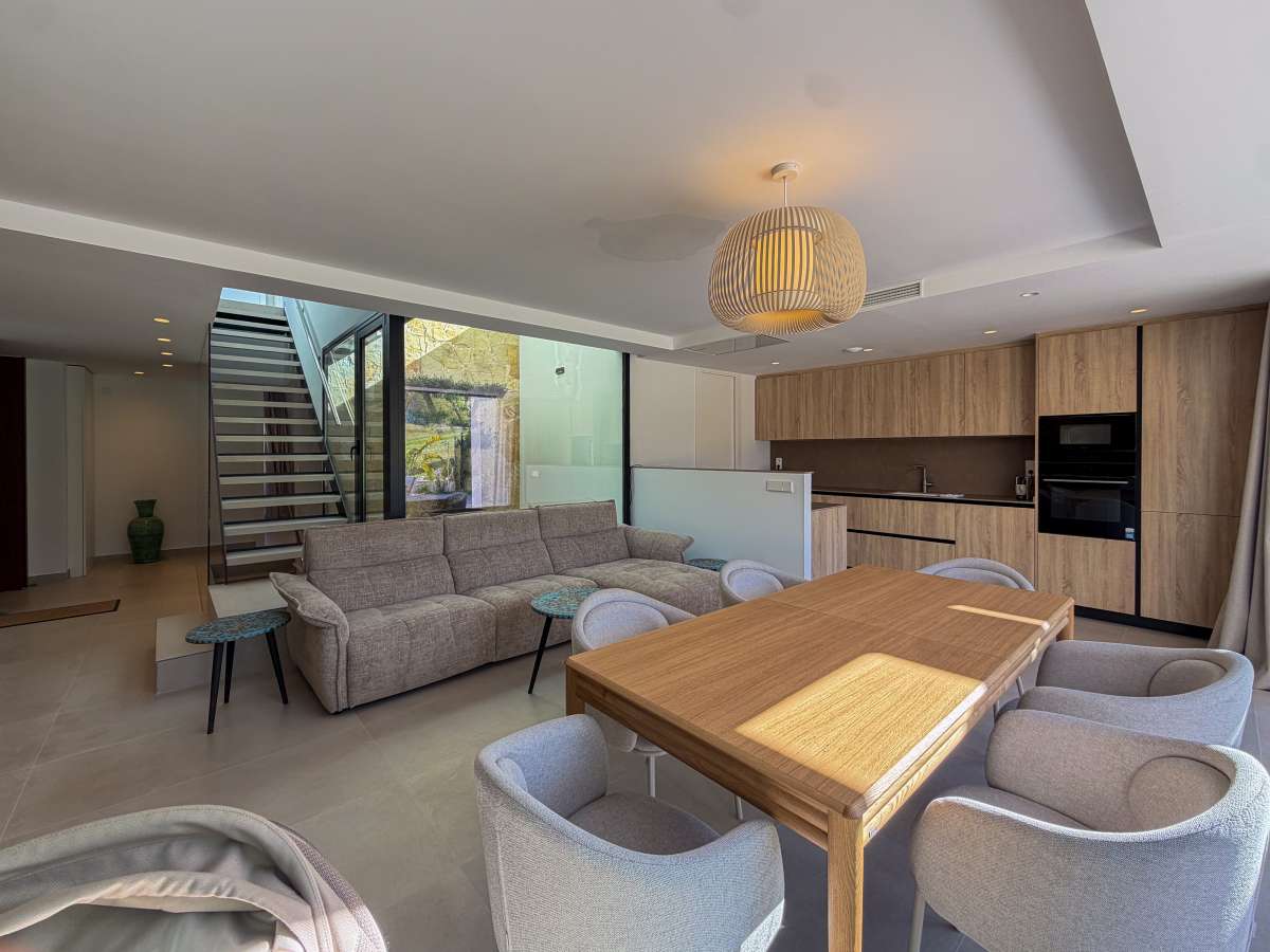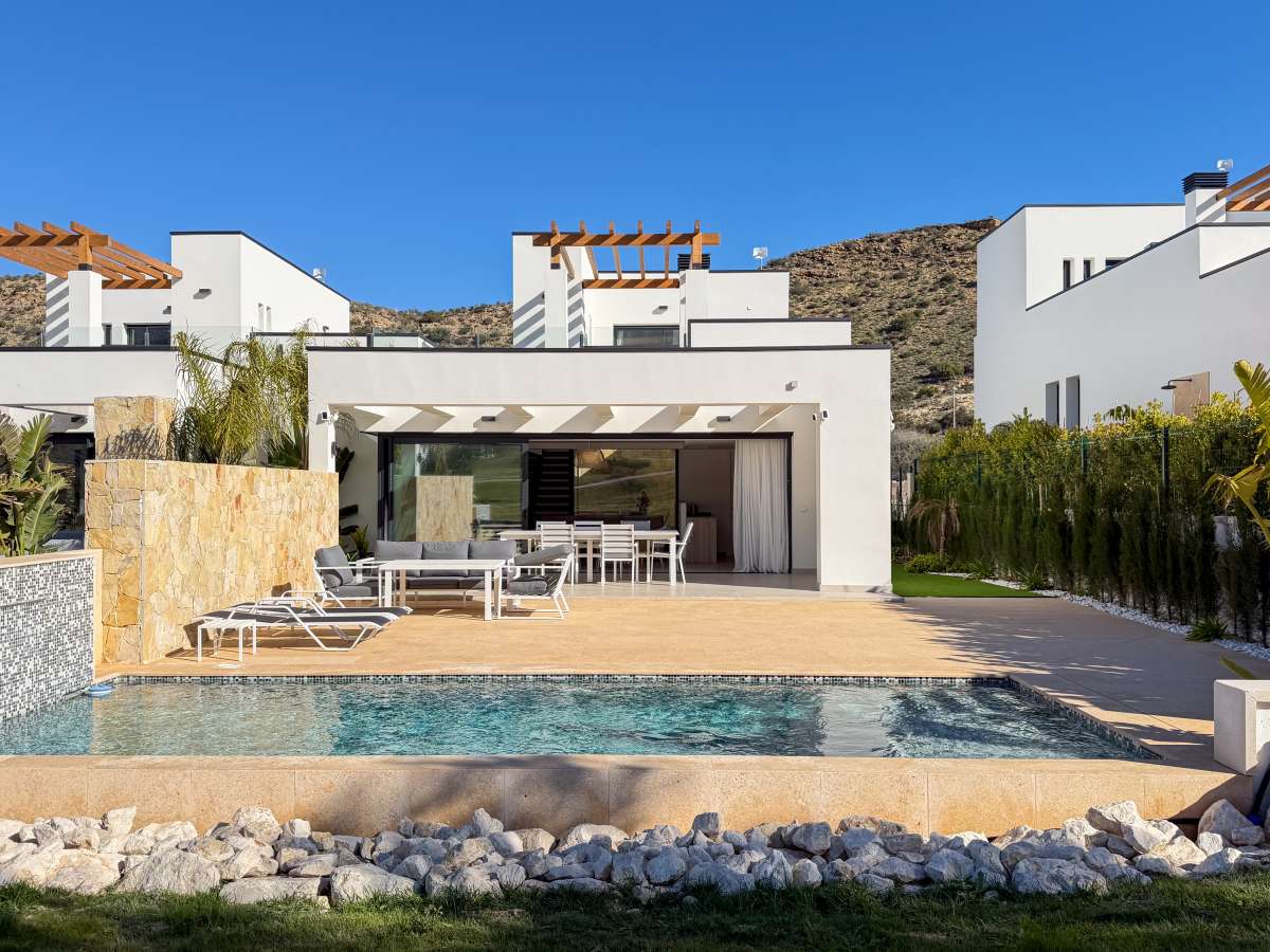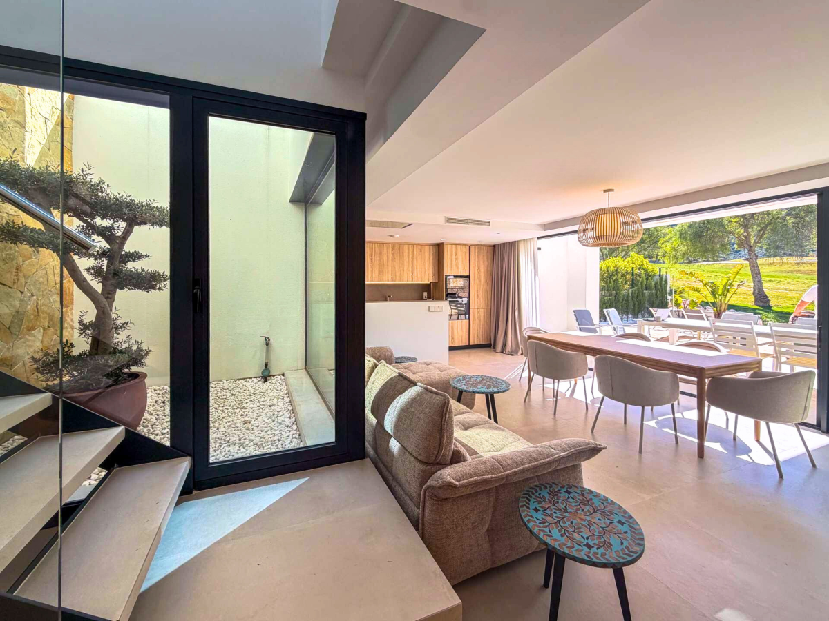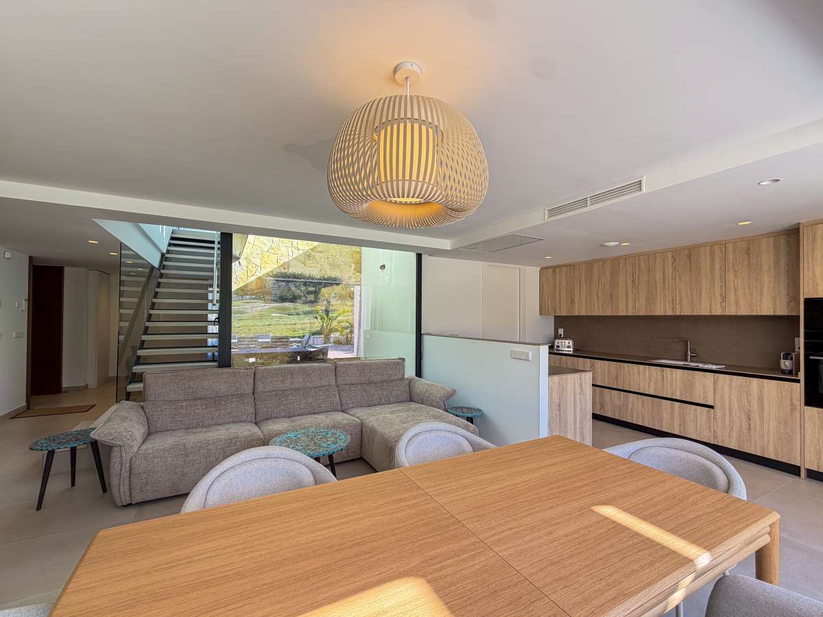 Discover this spectacular pre-owned villa of the exclusive Makalu II model, situated on the first line of the golf course within the prestigious Font del Llop Golf Resort, a privileged setting that combines nature, privacy, and a unique lifestyle on the Costa Blanca. This property stands out for its modern design, spacious rooms, and seamless integration with the surroundings, offering breathtaking open views of the golf course from its terraces and outdoor areas. On the main floor, the villa features a large and bright living-dining room with an open-plan kitchen, creating an elegant and functional space. From here, you have direct access to the outdoor terrace, where the private pool and golf course views take center stage. Also on this floor are two bedrooms and two bathrooms, one of which is en suite, as well as a convenient separate laundry room. Upstairs, there is an en suite bedroom with access to a large private terrace, ideal for enjoying the sun and unobstructed views of the natural surroundings and the golf course. The generously sized basement adds significant value to the property, offering space for a cinema room or entertainment area, as well as two additional bedrooms and two bathrooms, allowing the home to be adapted to different needs, whether for guests or family use. The property is completed with a private garden, swimming pool, spacious terraces, and on-site parking, all in a home designed to enjoy the Mediterranean climate year-round. Located just 10 minutes from Alicante Airport and approximately 20 minutes from the beaches, Font del Llop offers an exclusive setting with an 18-hole golf course, restaurant, sports facilities, and all necessary amenities. A unique opportunity for those seeking design, exclusivity, and quality of life on the golf course.