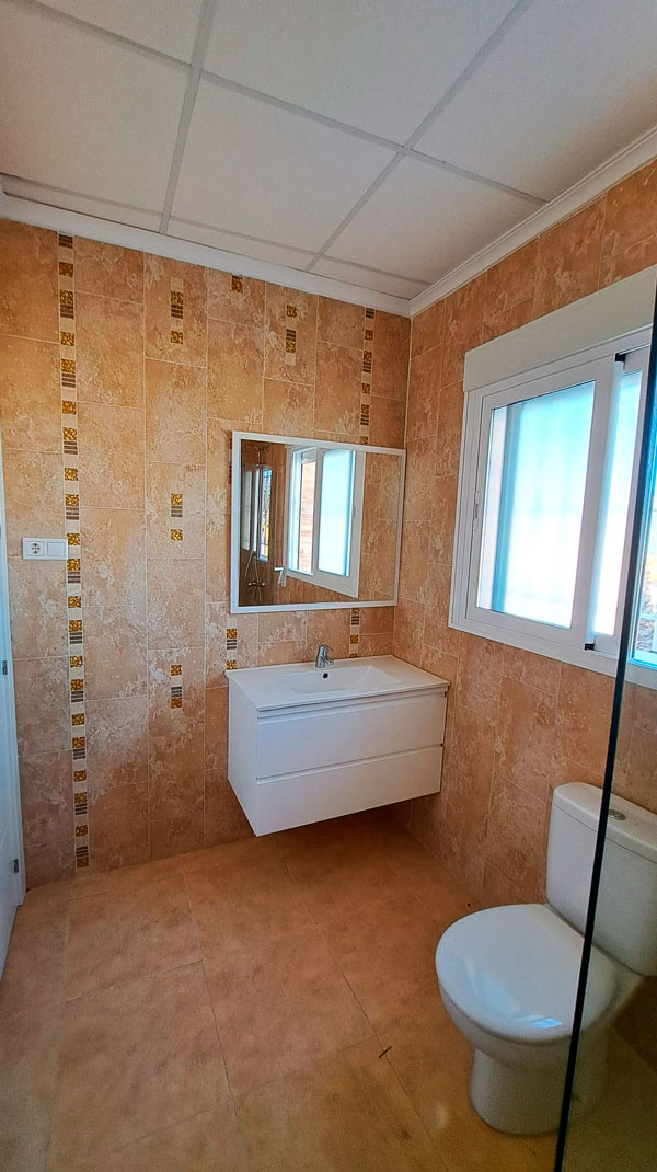Modern finished villa in the Catral countryside.There is a living area of 140 m2, comprising three bedrooms with fitted wardrobes, two bathrooms , one of which is ensuite, a spacious living/dining room and a modern kitchen.At the front of the property there is a covered terrace and to the side a storage room located under the stairs leading to the roof terrace with views of the countryside.The property has pre-installation of air conditiong and the entrance gate can be connected to an electric motor.Located on a walled plot of 2300 m2 landscaped with gravel for easy maintenance.Only minutes from the centre of Catral , 15 minutes drive to the beautiful sandy beaches of La Marina and 30 minutes to Alicante airport.