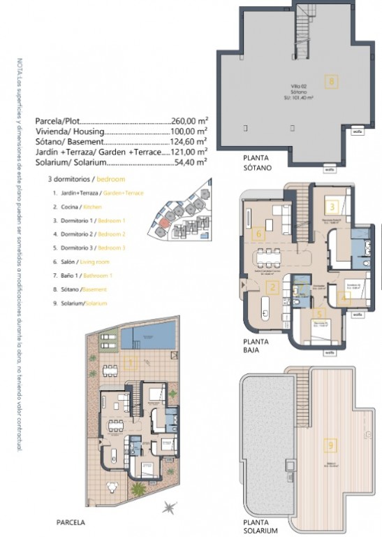 De villa's hebben 3 slaapkamers, 2 badkamers, een ruw afgewerkte kelder (+-115 m²) en een solarium van +-54 m². Ze hebben een bebouwde oppervlakte van +-210 m² en zijn gebouwd op percelen van 256 m² tot 475 m².
