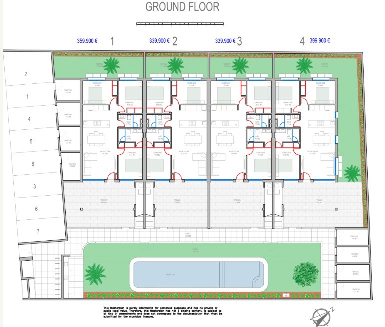 De buitenkant van deze woningen is ontworpen om optimaal te genieten van het mediterrane klimaat. Elke bungalow beschikt over een eigen tuin, perfect voor het creëren van een persoonlijke groene ruimte of om te genieten van momenten in de buitenlucht. De ruime terrassen bieden een ideale plek om te ontspannen of te delen met vrienden en familie, terwijl het solarium extra ruimte biedt om te zonnebaden of van het uitzicht te genieten. De gemeenschap beschikt ook over gemeenschappelijke tuinen, wat een vleugje natuur en frisheid toevoegt aan de omgeving.