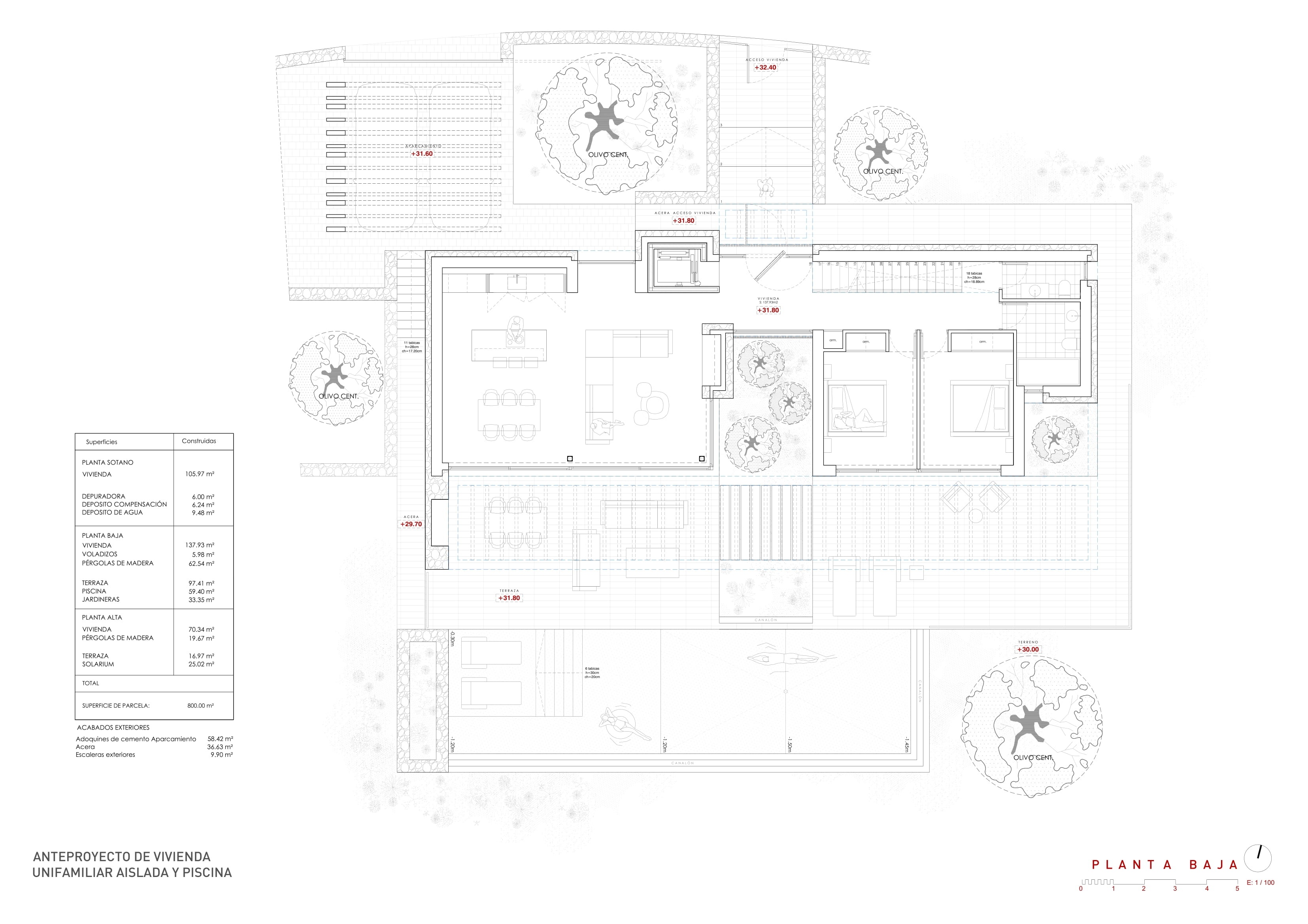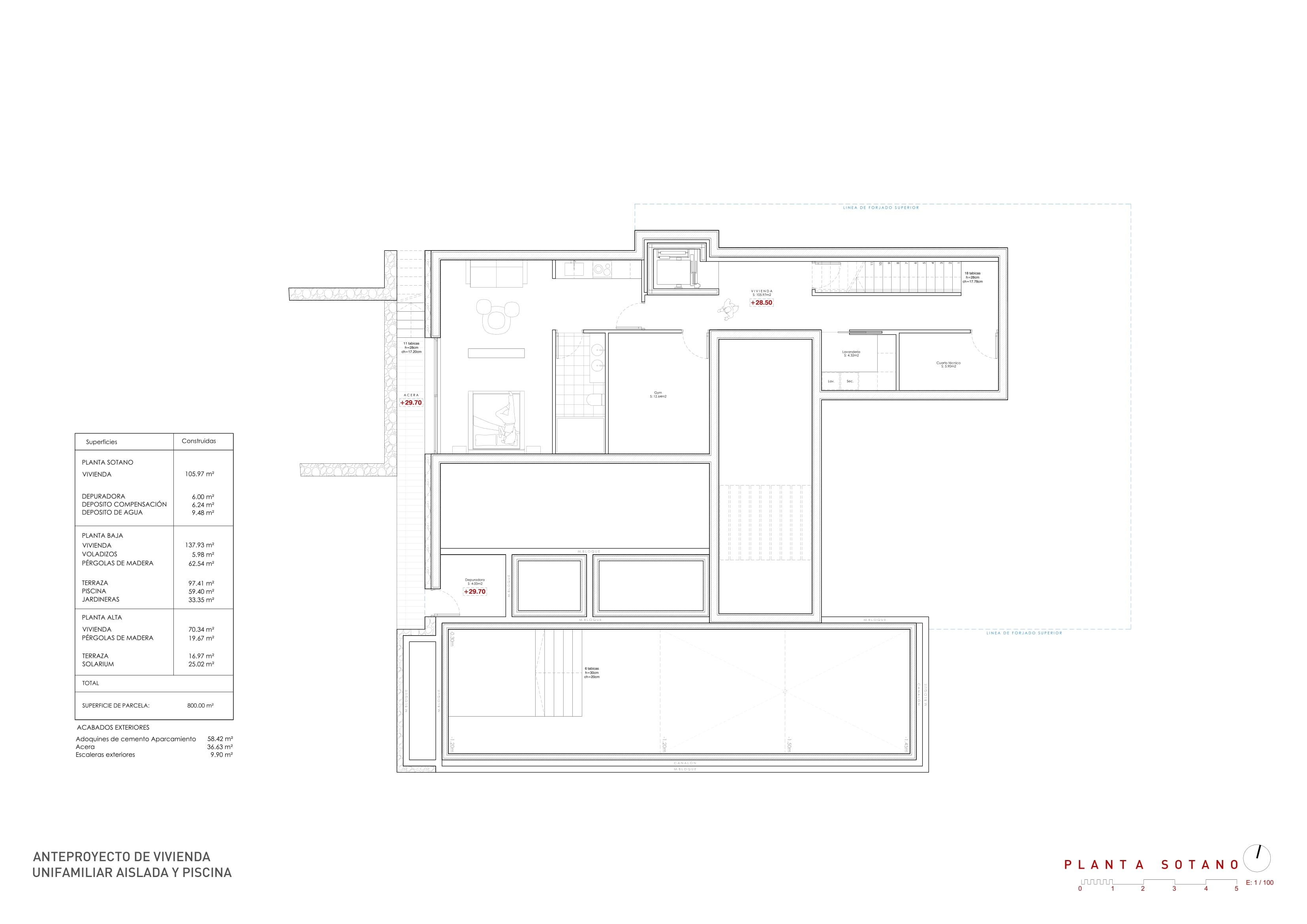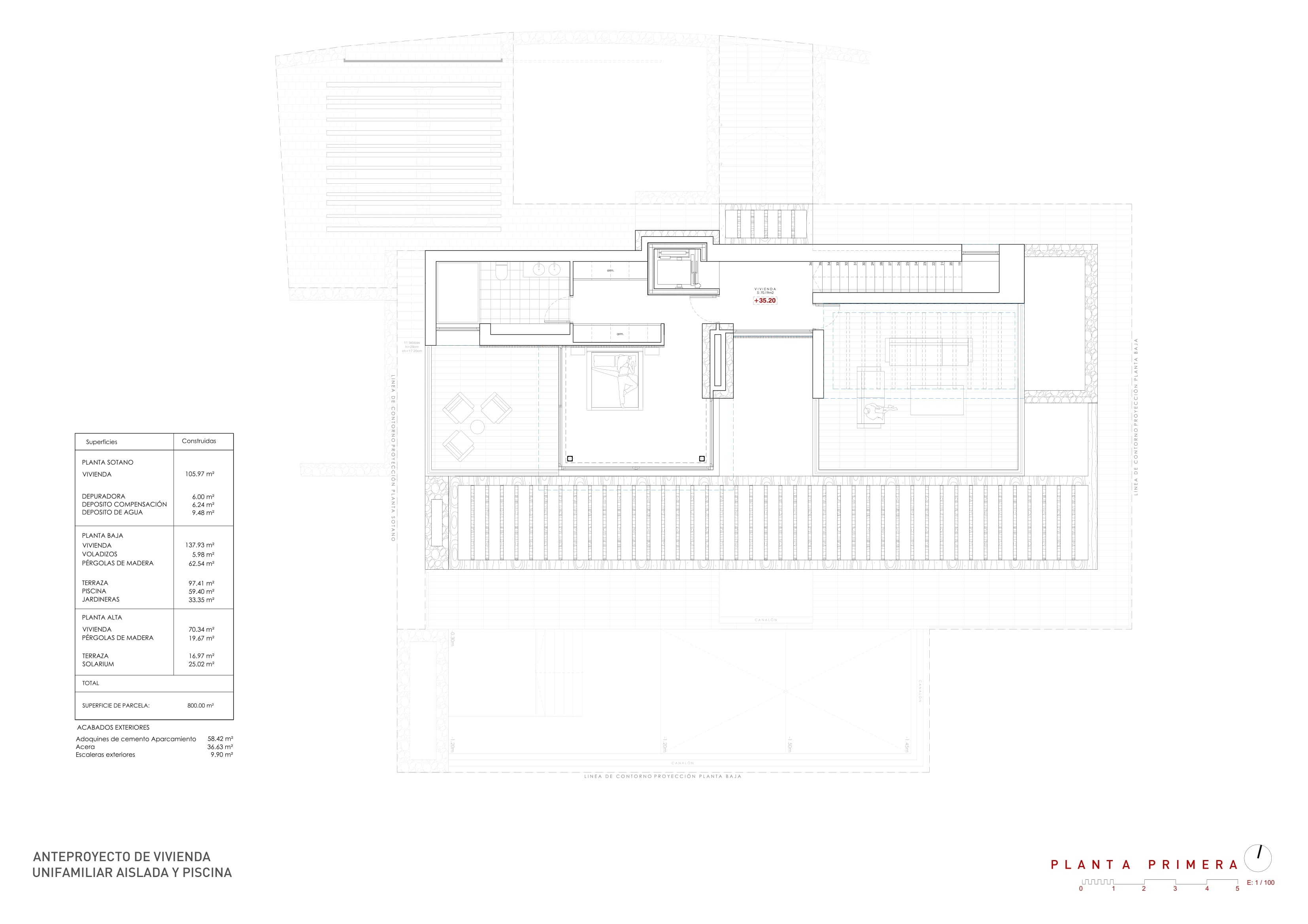 Deze exclusieve nieuwbouwvilla is gelegen op een perceel van 800 m² aan de Calle Blat, op een steenworp afstand van het strand van La Fustera. De architectuur combineert mediterrane warmte met eigentijdse elegantie en combineert natuursteen, hout en zachte neutrale tinten, die harmonieus integreren met het kustlandschap. Met een totale bebouwde oppervlakte van 716 m², verdeeld over drie verdiepingen kelder, begane grond en eerste verdieping biedt de villa een perfecte balans tussen functionaliteit, design en comfort. De kelder van 105,97 m² is ontworpen voor zowel praktische als recreatieve doeleinden. Het beschikt over een volledig uitgeruste fitnessruimte, een wasruimte en technische ruimtes, met de mogelijkheid om extra ruimtes te creëren, zoals een wijnkelder, een bioscoop of een multifunctionele ruimte. Op deze verdieping bevinden zich ook het zwembadfiltersysteem en de watertanks, wat zorgt voor efficiënt beheer van alle technische installaties. De begane grond, met een oppervlakte van 137,93 m², ontvouwt zich als een open en lichte ruimte die de essentie van het mediterrane leven weerspiegelt. De ruime woonkamer, eetkamer en keuken komen via grote kamerhoge ramen uit op het hoofdterras en het infinity pool, met een spectaculair panoramisch uitzicht op zee dat het karakter van deze woning bepaalt. Twee tweepersoonsslaapkamers, een complete badkamer en een gastentoilet completeren deze verdieping en bieden comfort en functionaliteit. Buiten bedekt een houten pergola de woon- en eetruimtes, omgeven door weelderige tuinen, zonovergoten terrassen en een infinity pool van 59,40 m² dat visueel naadloos overgaat in de zee. De bovenste verdieping, met een oppervlakte van 70,19 m², is gewijd aan de master suite een privé-retraite met een kleedkamer, een en-suite badkamer en een groot privéterras met een adembenemend uitzicht op de Middellandse Zee. Een tweede slaapkamer of kantoor completeert deze verdieping, die ook toegang biedt tot een solarium van 25,02 m², ideaal om te ontspannen in de zon en te genieten van de rust van de omgeving. Deze woning ligt in een rustige woonstraat, omringd door moderne villa's, op een uitzonderlijke locatie op slechts 3 minuten lopen van het strand van La Fustera, de Mandala Beach Bar & Restaurant en essentiële voorzieningen zoals supermarkten en lokale winkels. Ontworpen met de focus op licht, ruimte en een naadloze verbinding tussen binnen en buiten, belichaamt deze villa de moderne mediterrane levensstijl: elegant, ontspannen en in perfecte harmonie met het spectaculaire panoramische uitzicht op zee.