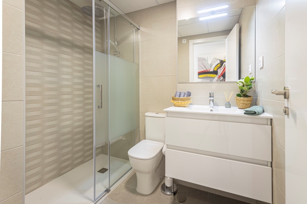 Appartementen met gepantserde toegangsdeur en deuren gelakt in het wit met roestvrijstalen beslag. Witte, monobloc jaloezieën en dubbele beglazing. In de hoofdslaapkamer ingebouwde kledingkast met schuifdeuren, met een scheidingsplank in de mezzanine, een bar en een ladekast met drie laden. Keuken met hoog en laag meubilair, in het wit, gola-type handgreep, enkele spoelbak met afdruiprek, keramische kookplaat, elektrische oven en afzuigkap. Voorinstallatie van airconditioning (koud en warm) via leidingen met voorziening van zonering van kamers.