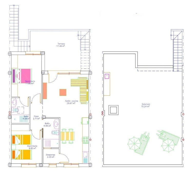 De appartementen op de bovenste verdieping hebben 2 slaapkamers, 2 badkamers, een terras en een privésolarium (+-70m²) .