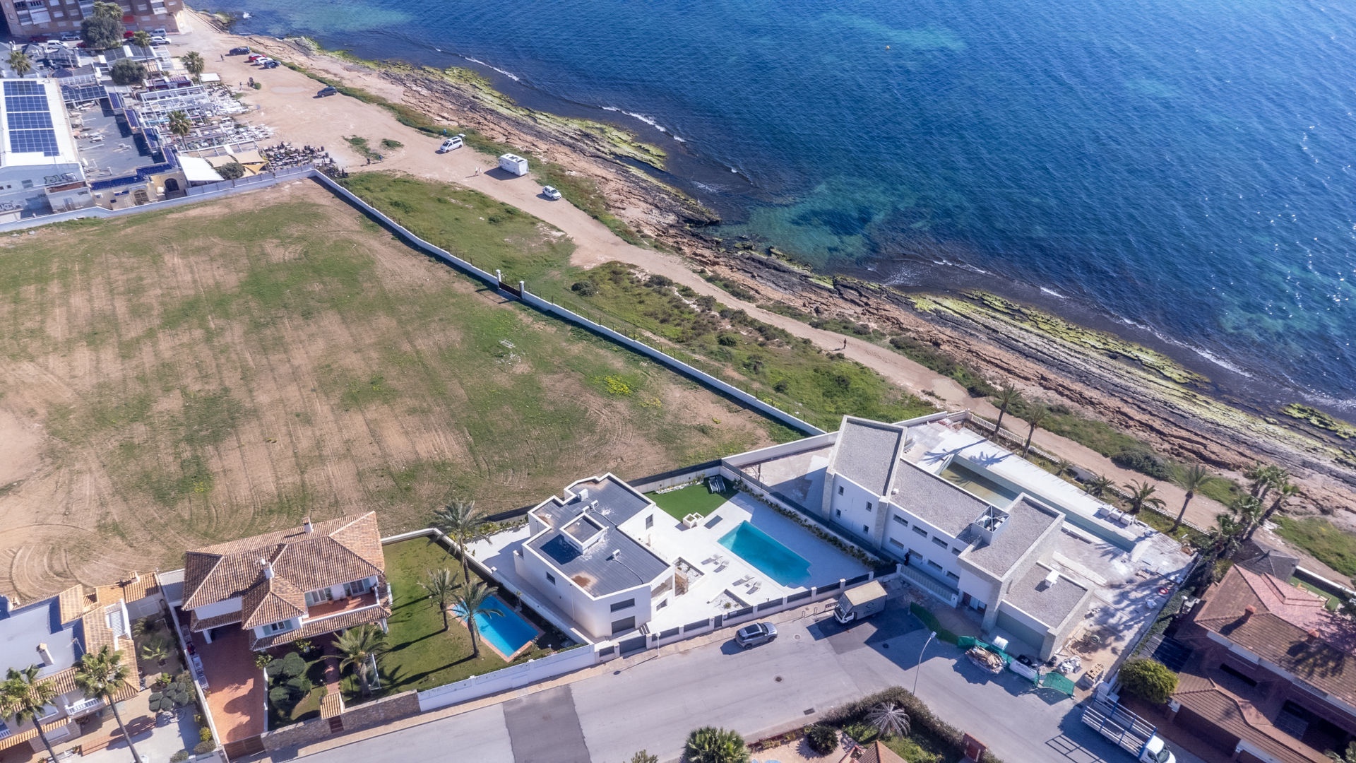 Privacy, Elegance and Spacious Living This exclusive detached villa is located in the highly sought-after area of La Veleta in Torrevieja, just a few steps from the sea, and impresses with breathtaking, unobstructed sea views. The property combines modern architecture, high-quality materials, and a well-designed layout with the Mediterranean lifestyle of the Costa Blanca. Situated on a generous 776 m² plot, the property offers a built area of 369 m² and 279 m² of living and usable space. The two-storey house features bright, open spaces and spacious outdoor areas that can be enjoyed all year round. The heart of the villa is the bright living and dining area with direct access to the garden and the private pool. The open-plan kitchen blends harmoniously into the modern living concept. In total, the property offers 5 spacious bedrooms and 3 stylish bathrooms, making it ideal for families or as a prestigious holiday residence. Exclusive Property Details Plot: approx. 776 m² Built area: approx. 369 m² Living and usable area: approx. 279 m² Bedrooms: 5 Bathrooms: 3 Ground Floor * 2 bedrooms * 1 bathroom * Separate living area * Double garage Upper Floor * Spacious living and dining room * Open-plan kitchen * 3 bedrooms * Master bedroom with en-suite bathroom * Additional bathroom * Sun terrace with open views Outdoor Area The well-maintained garden with high-quality artificial grass offers multiple possibilities, including a mini football area as well as several lounge and relaxation zones. The private swimming pool, with approximately 50 m² of water surface, is surrounded by a sunny terrace, creating the perfect setting for relaxation and social gatherings outdoors. The fully fenced property guarantees maximum privacy and security. Features & Highlights South-facing orientation High-quality materials and excellent finishes Air conditioning and climate control system Private garage of approx. 40 m² Storage / basement room Modern security system with 24/7 monitoring, live video, and connection to local authorities Worldwide control and monitoring via smartphone or computer Pre-owned property in excellent condition Energy certificate available high energy efficiency (Class B) Location This exclusive villa enjoys a privileged frontline location to the Mediterranean Sea in La Veleta. The sea stretches directly in front of the property, giving the home an exceptional location quality. At the same time, the beaches of Orihuela Costa and the center of Torrevieja can be reached within just a few minutes. International schools, top golf courses, shopping centers, and a wide range of restaurants complete the excellent infrastructure. Here, sea, sun, and Mediterranean lifestyle combine with privacy and upscale living comfort.