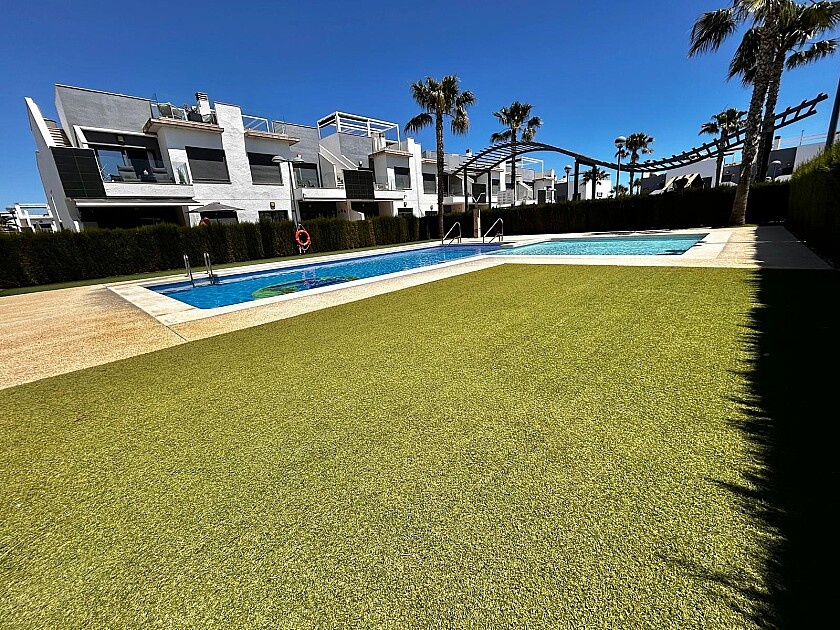 2-bedroom ground-floor bungalow in Pilar de la Horadada . 2-bedroom ground floor bungalow in Pilar de la Horadada. This modern-style home boasts a large communal garden, swimming pool, and children's playground. It is sold fully furnished and equipped and has a private parking space. Located in a large residential area of Pilar de la Horadada, a prime location for families due to its easy access to all kinds of services. It is located just a few minutes' drive from the city center, where you'll find all the necessary services, such as supermarkets, shops, restaurants and bars, as well as beautiful squares.