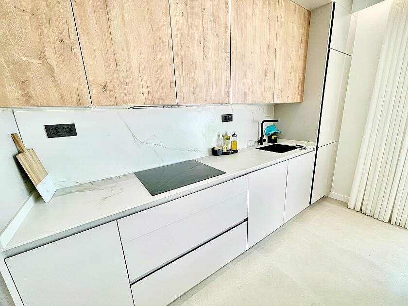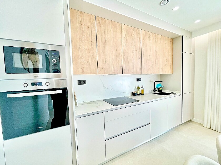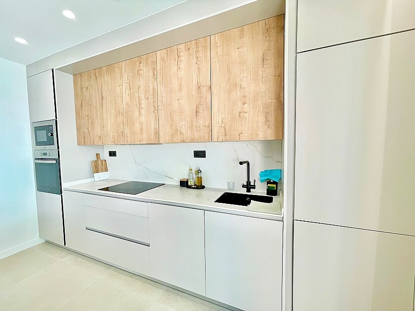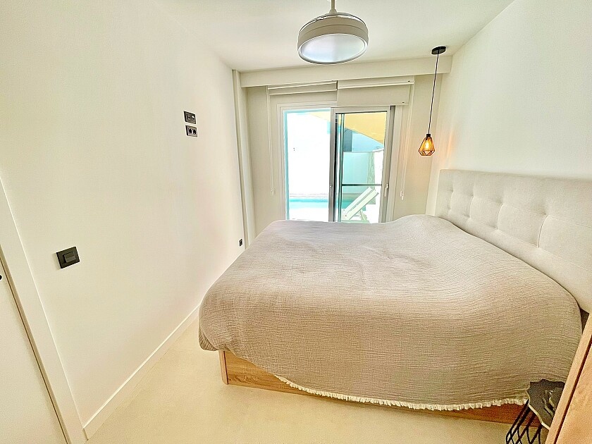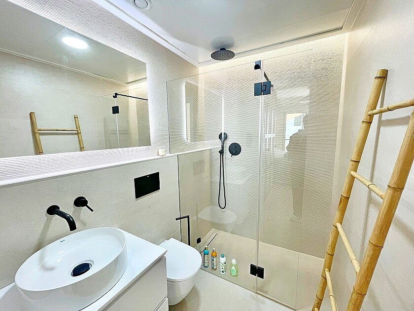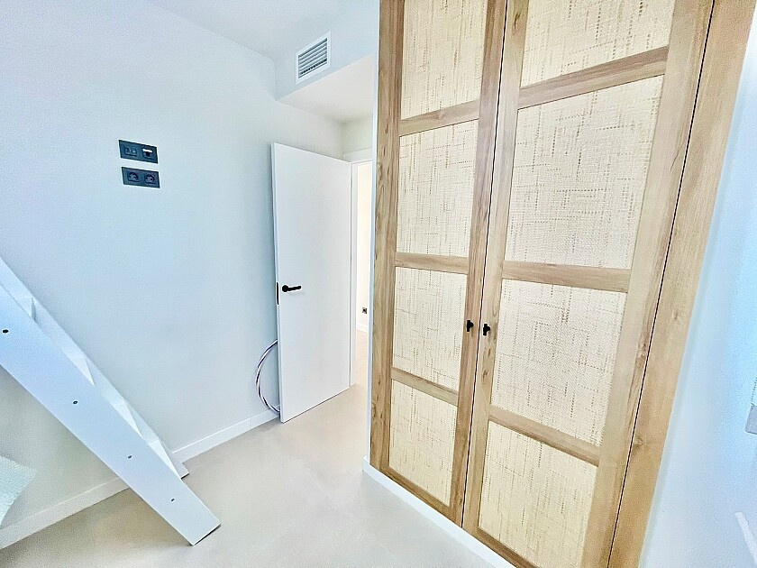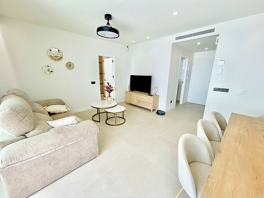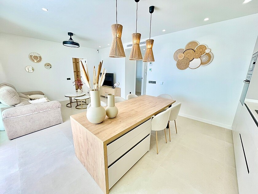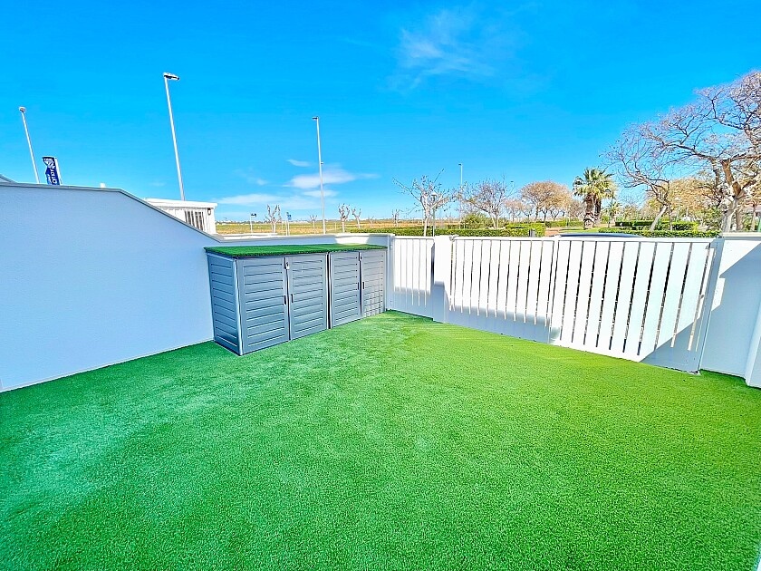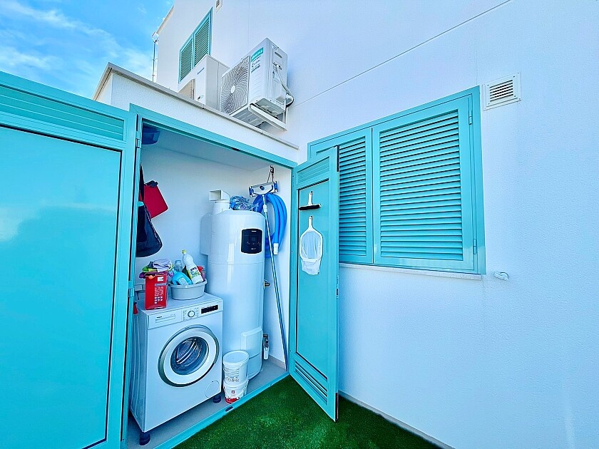 3 bedroom ground floor bungalow 400 m. walk to the beach in Torre de la Horadada. Ground floor bungalow with 3 bedrooms and 2 bathrooms on Las Higuericas beach in Torre de la Horadada. This spacious and bright bungalow offers a living-dining room with an open kitchen, large bedrooms, one of which is a suite, and direct access to the private pool. It also offers a car entrance in the private garden. The home is sold furnished, with a fully equipped kitchen, underfloor heating, air conditioning, large terraces, and a private pool. Just 400 meters away are Higuericas Beach and El Pilar de la Horadada. The bars and restaurants are a 1-minute walk away. The distance to Alicante Airport is 60 kilometers, and to Corvera-Murcia Airport, 50 kilometers.