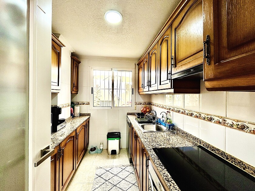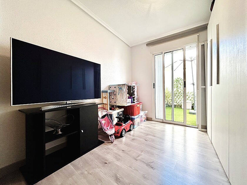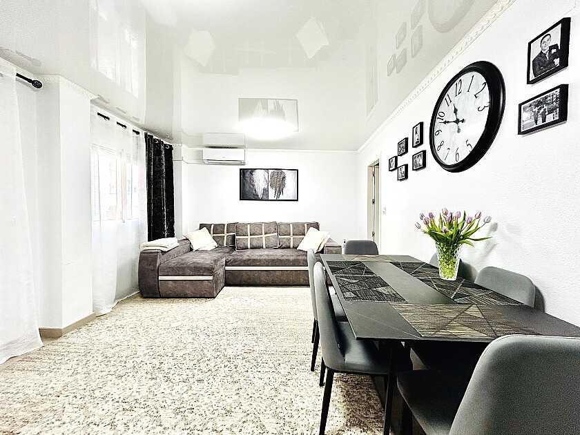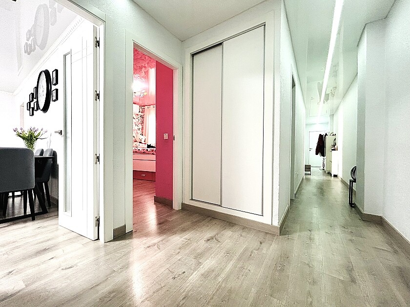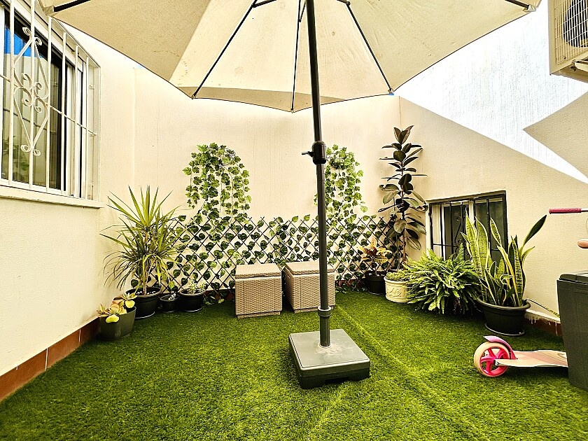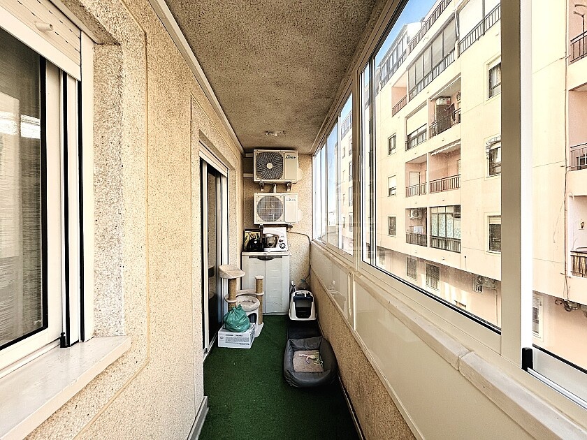 Apartment with 4 bedrooms in Aguas Nuevas (Torrevieja). Spacious apartment in the centre of Torrevieja. This renovated first floor home has 4 bedrooms, one of them with a private bathroom and another bedroom with a private patio, a living-dining room, a separate kitchen, a laundry room and a glazed terrace. It is kept in very good condition, it is sold fully furnished, with air conditioning, built-in wardrobes and a fully equipped kitchen. The building has an elevator and underground parking, with the possibility of renting or buying a space. Very good location: walking distance to all amenities, restaurants, cafes, supermarkets, public transport... 15 minutes walk to the weekly market, water park, sports centre and the Ozone, Habaneras and Carrefour shopping centres, the same time to the promenade and city centre.