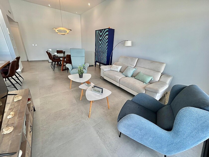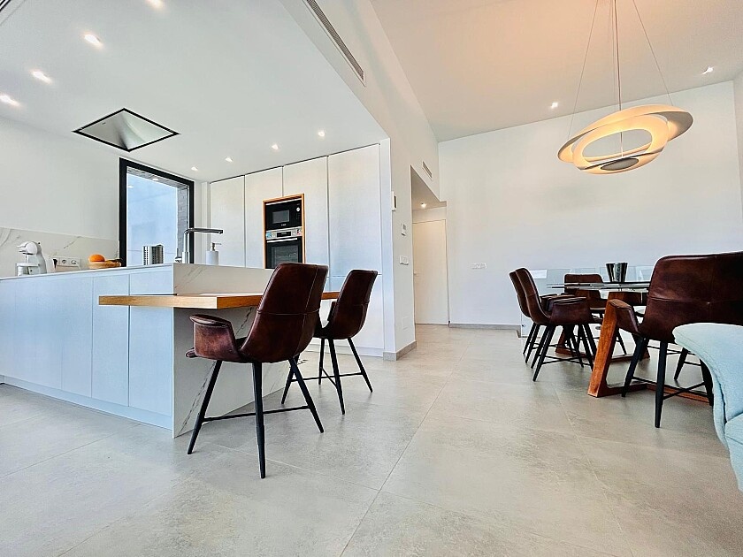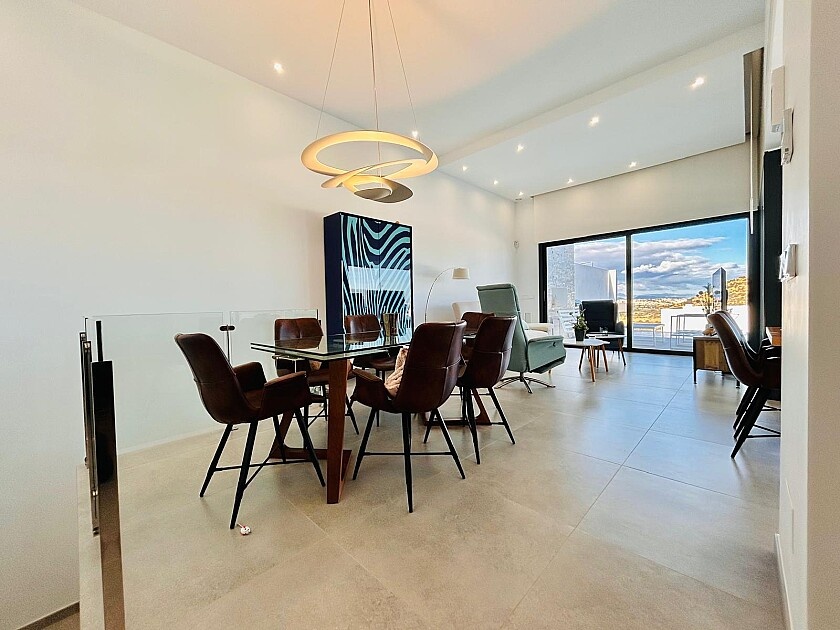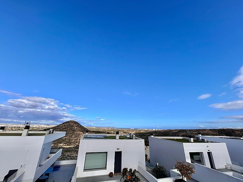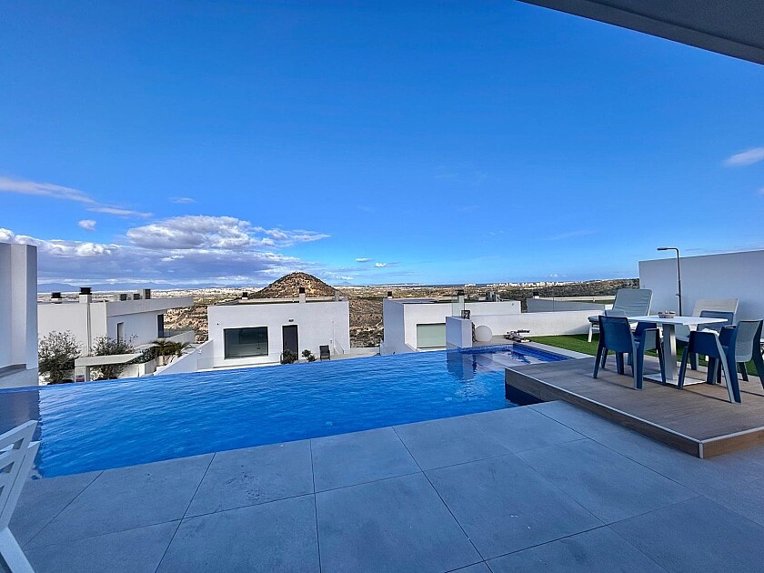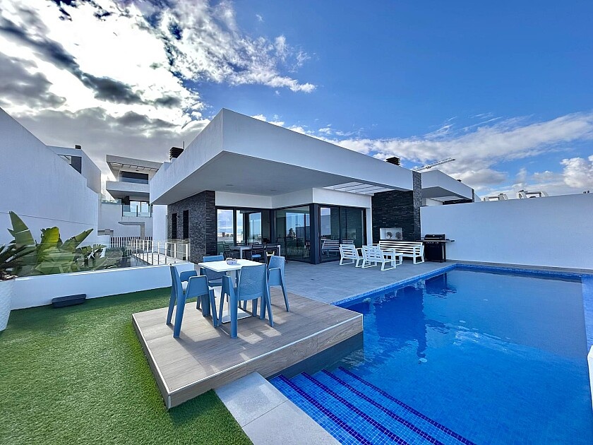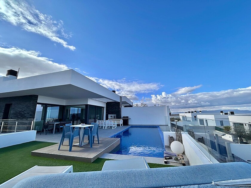 Luxury detached villa with sea views in Ciudad Quesada . This villa built on two floors has 3 bedrooms and 3 bathrooms, open plan kitchen and living/dining room, with access to the garden with another covered outdoor dining area, fitted wardrobes, private solarium, basement, double garage and private garden with infinity pool with waterfall and excellent sea views with panoramic views over the bay of Guardamar and Santa Pola. On the ground floor there is a large relaxation room with an underwater pool observatory. In addition to the La Marquesa golf course, the La Finca golf course is nearby, as well as the water park and the towns of Rojales, Almoradí, Guardamar and Torrevieja and their beaches. Modern luxury villa next to La Marquesa golf course in Rojales
