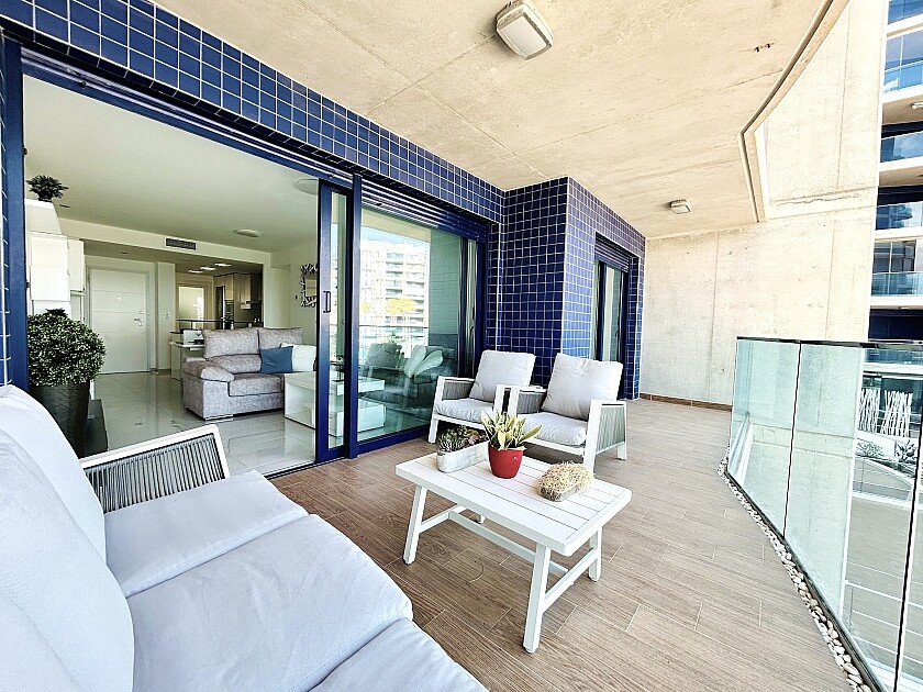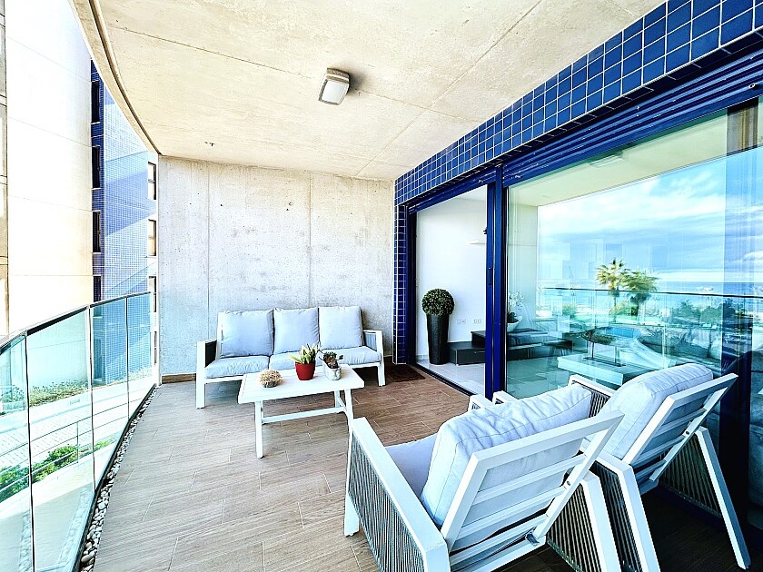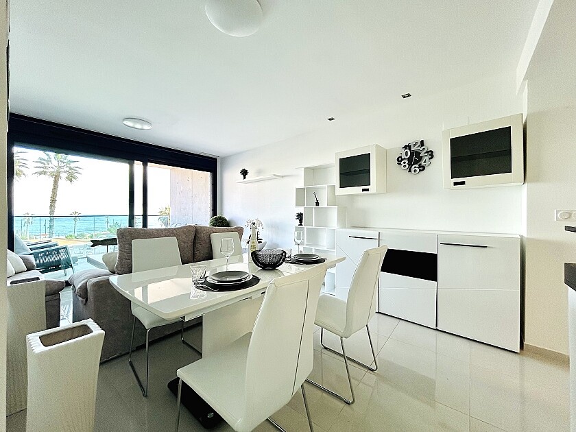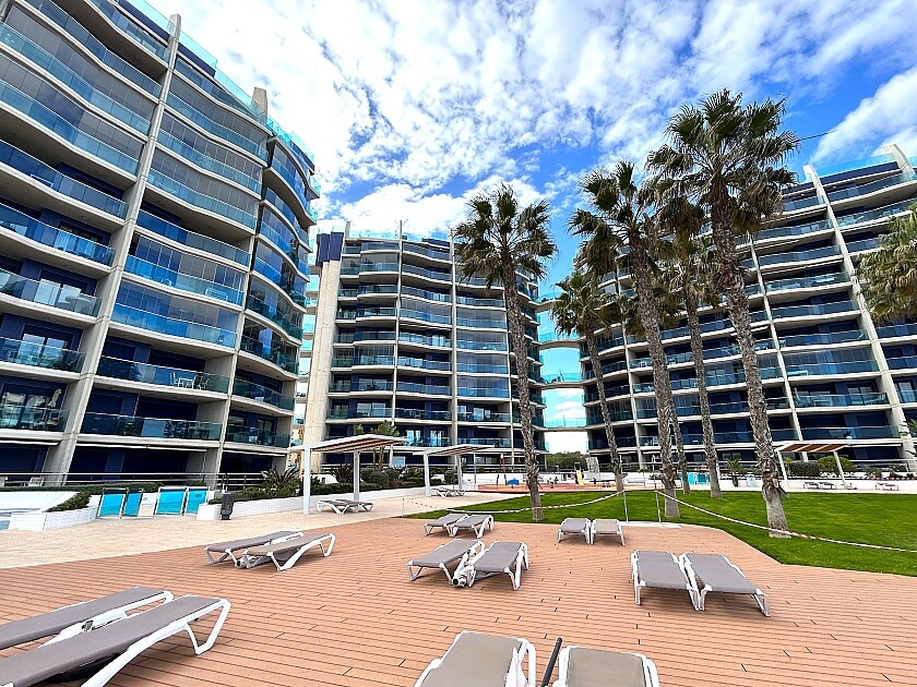 Apartment with 2 bedrooms near the sea in Punta Prima. Luxury apartment with 2 bedrooms and 2 bathrooms and 2 terraces: a large east-facing front terrace with spectacular views of the sea, Torrevieja and the communal areas with several swimming pools, gym, jacuzzi, sauna, children's and sports areas and a small south-facing terrace. Apartment is on the 1st floor. It also has underground parking and storage-room. Just a few metres walk to the sandy beach of Punta Prima and Cala Ferrís, close to shops, restaurants, cafes, public transport and other services. 5-10 minutes drive to the center of Torrevieja, Zenia Boulevard shopping center and several golf courses in the area.