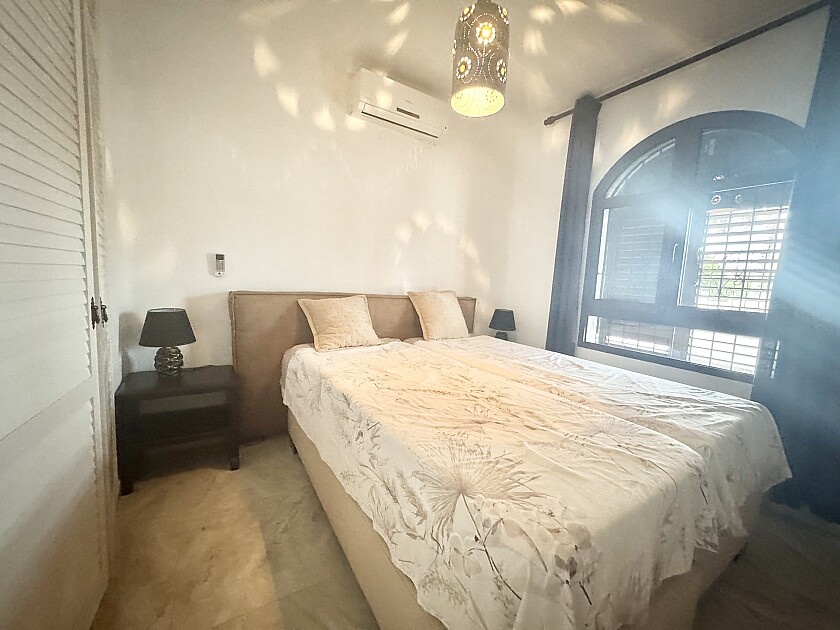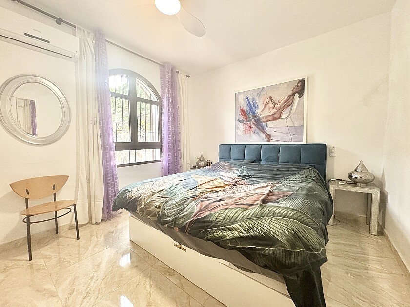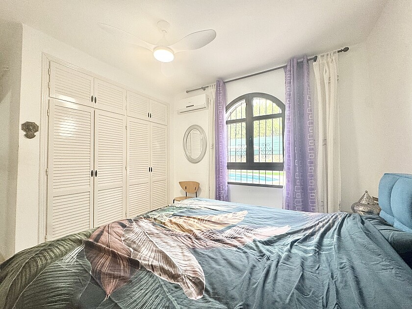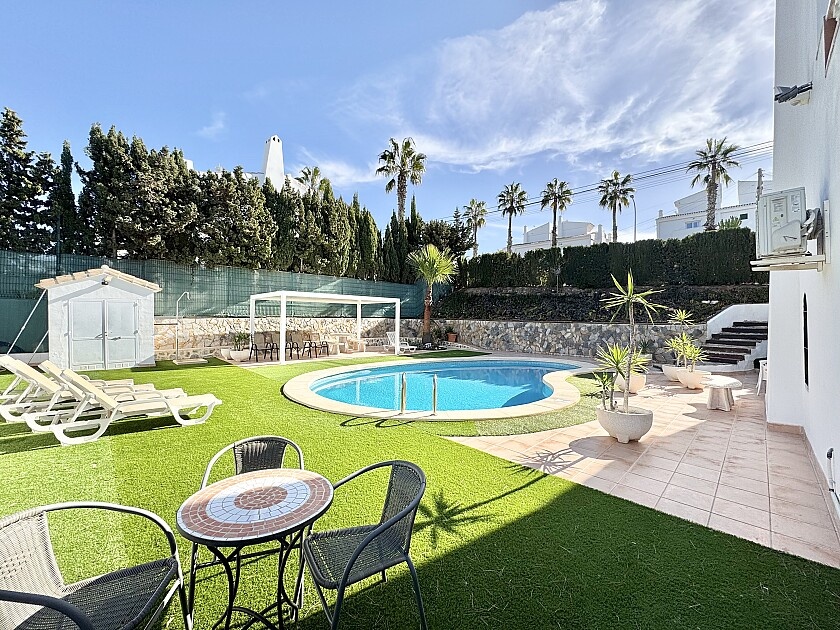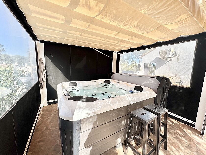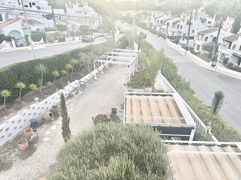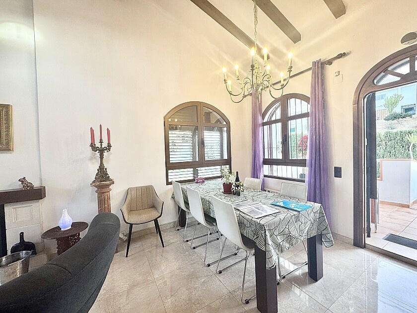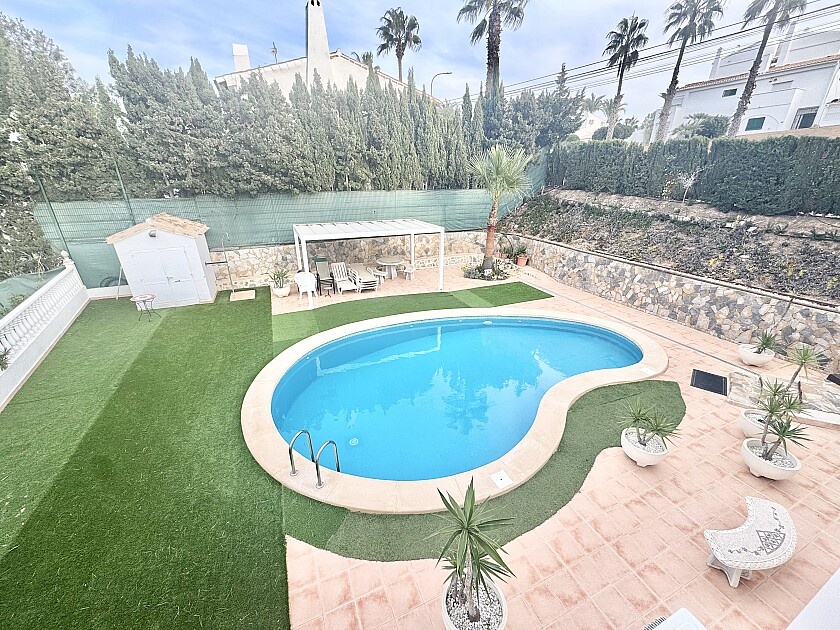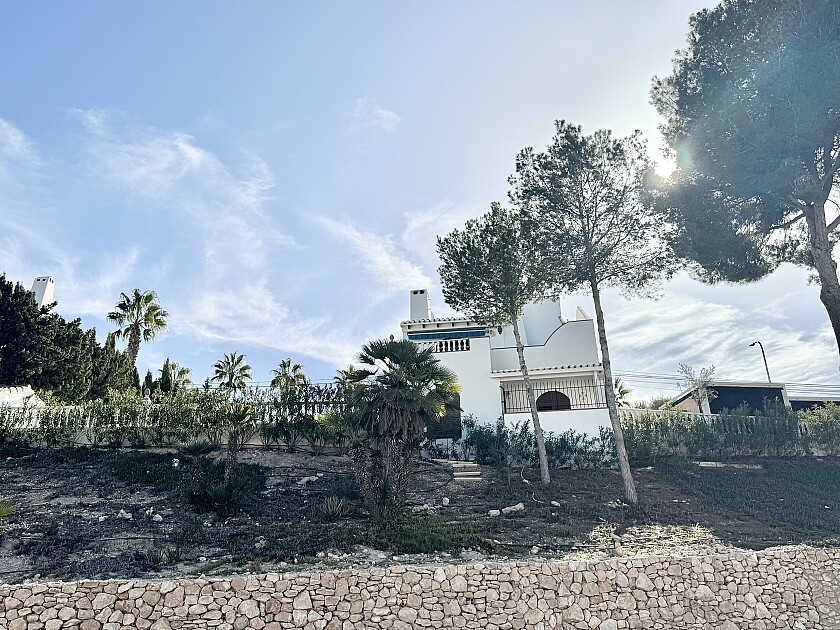 4 bedroom detached villa with views to Villamartin golf course. Detached villa with 4 bedrooms and 2 bathrooms and private pool. This south-facing villa with views of the Villamartin golf course enjoys a large 900 m2 plot, private pool, jacuzzi and solarium. Sold fully furnished and equipped, recently renovated and with a fireplace on each floor and air conditioning. This chalet has a tourist license, therefore it is a great opportunity either for investment or to live all year round. It is located 20 minutes walk from the square and the golf course of Villamartín and a few minutes drive from the beaches of Orihuela Costa.