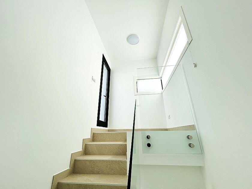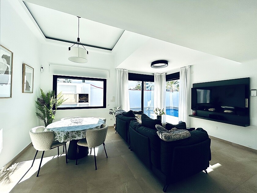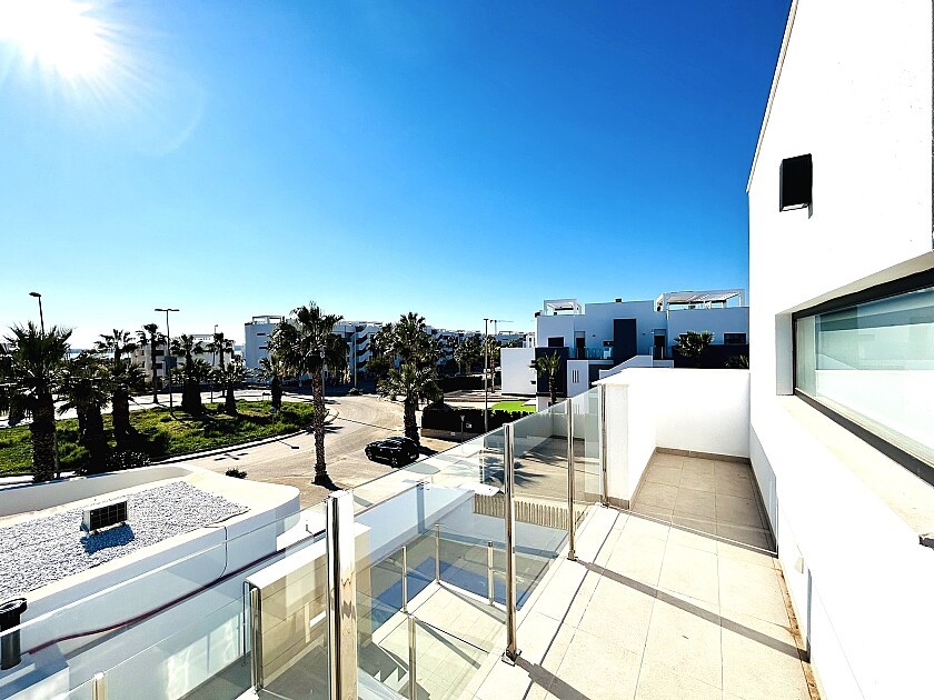 3 bedroom detached villa with pool in Guardamar del Segura with garden and pool in Guardamar del Segura . Detached two-storey villa with private plot in El Raso, 10 minutes drive to La Mata beach and Guardamar del Segura. The ground floor consists of a living room, kitchen, toilet, a bedroom with dressing room and bathroom . On the first floor , which is accessed by the internal staircase from the ground floor, there are two bedrooms, a bathroom and access to a porch, terrace and solarium with pergola. It is in very good condition, has air conditioning, electric blinds, underfloor heating in the bathrooms, built-in wardrobes, and is sold with furniture and appliances. You can also enjoy a private pool, garden, parking and summer kitchen.