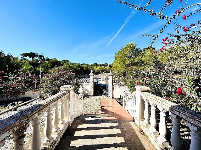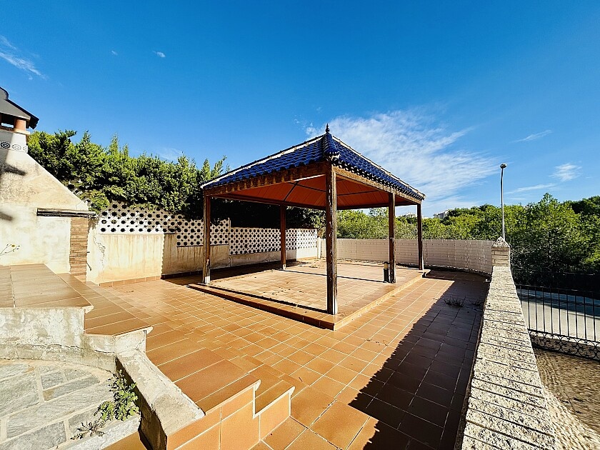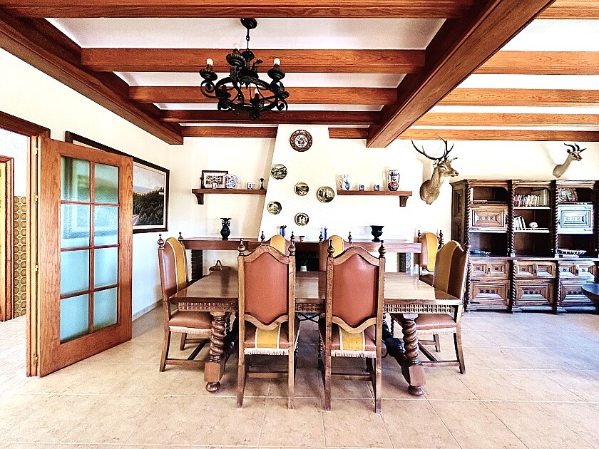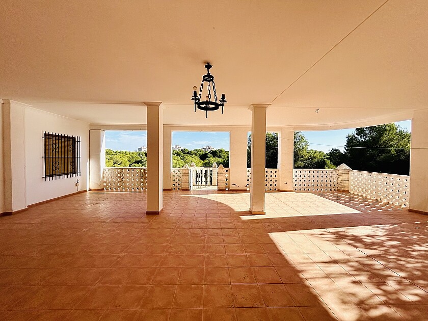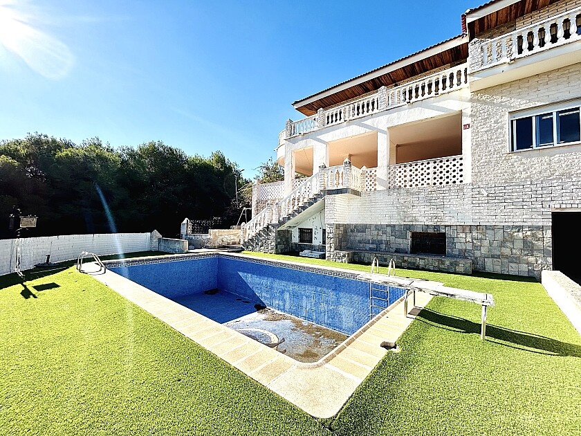 Detached villa in Dehesa de Campoamor. Detached villa with large garden, garage and private pool just a few metres from the beach of Dehesa de Campoamor. The house has 800 m2 built on 3 levels. On the ground floor there are 8 bedrooms, 7 bathrooms, a spacious living room with open kitchen, fireplace and a large terrace. On the ground floor there are another 2 bedrooms, 2 bathrooms, a spacious living room with kitchen and a covered terrace. In the basement there is a large garage for 2-3 cars and additional spaces where more bedrooms, a wine cellar, sauna, gym or similar can be made. The house is built on a plot of 1020 m2, with a large swimming pool, garden, gazebo and barbecue area. The house is ideal for living all year round or for renting. It is the ideal investment to open a mini-hotel with 8-10 rooms. It enjoys an ideal location on a hillside with panoramic views of the sea and the original coniferous forest of the Dehesa de Campoamor.