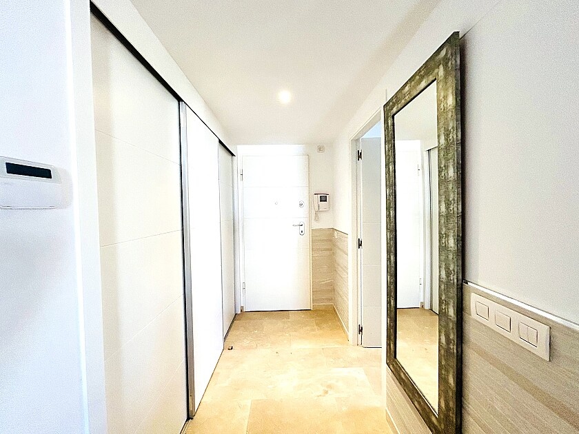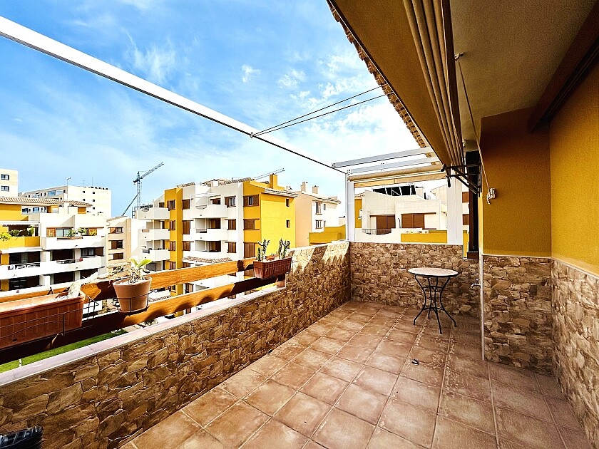 2 bedroom penthouse with terrace and solarium in Punta Prima . 2 bedroom penthouse with terrace and private solarium in Punta Prima. This house has a living room with kitchenette, 1 bathroom, terrace and large solarium on the 5th floor. The apartment facing south east. From the terrace and the solarium there are beautiful views of communal pool and green area. It has air conditioning, fitted wardrobes, underfloor heating in the bathrooms, blinds and an alarm system installed. It is in good condition, it is sold with furniture, electrical appliances and it also has parking and storage room in an underground car park. The house is located in a residential complex with a garden area and protected 24 hours a day with private surveillance, with several common swimming pools, leisure and children's areas. 350 meters from the beach, close to restaurants, bars, supermarkets and public transport. Excellent option for permanent residence, vacations or short or long term rental.