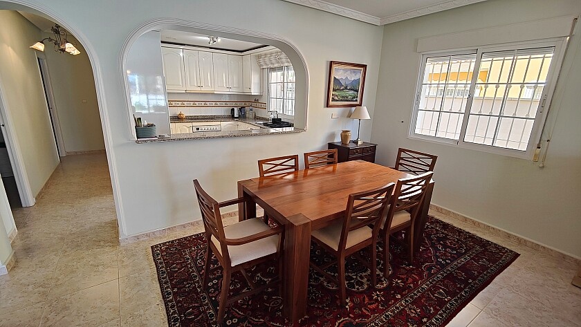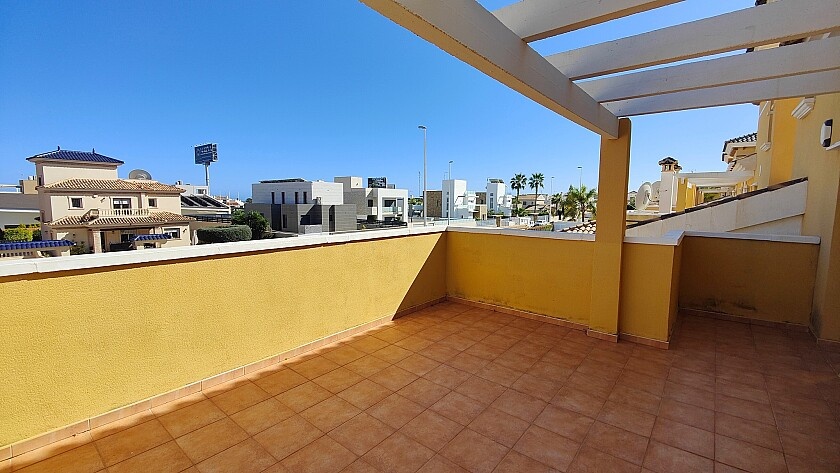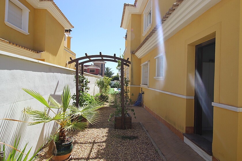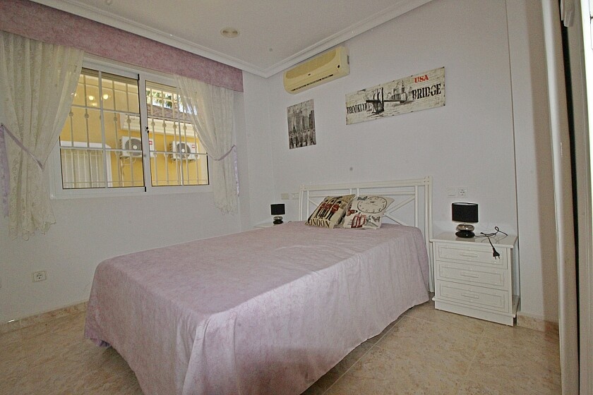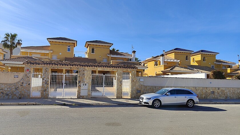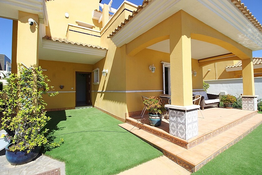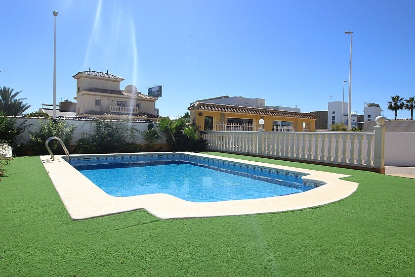 Detached 4-bedroom villa in La Zenia. Detached villa with 4 bedrooms and 2 bathrooms, with pool and private garden. It has a semi-open kitchen, a living room with fireplace. Enjoy a covered terrace on the ground floor with views of the pool and a southeast-facing terrace on the upper floor. Private parking and storage room. A few minutes from the La Zenia Boulevard shopping center, just 1 km from the beach and other services. 15 minutes by car from Torrevieja.