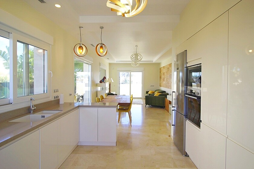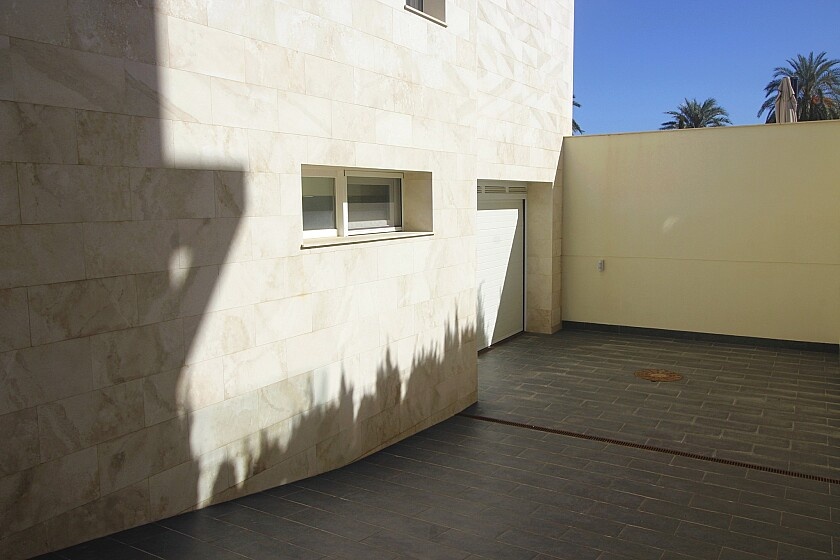 Detached 5-bedroom villa with sea views in La Zenia. Splendid luxury villa a few meters from the beach of La Zenia. This chalet has 3 floors with 5 bedrooms and 4 bathrooms, an open kitchen with a large living room and underfloor heating throughout the house. It is a modern and elegant building with a private pool and garden, an underground garage and a solarium with panoramic sea views. The house is a few meters from La Zenia beach, very close on foot to restaurants, cafes and bars, public transport and other services. 15 minutes walk to the La Zenia Boulevard shopping center, 10-15 minutes by car to several golf courses and the city of Torrevieja.