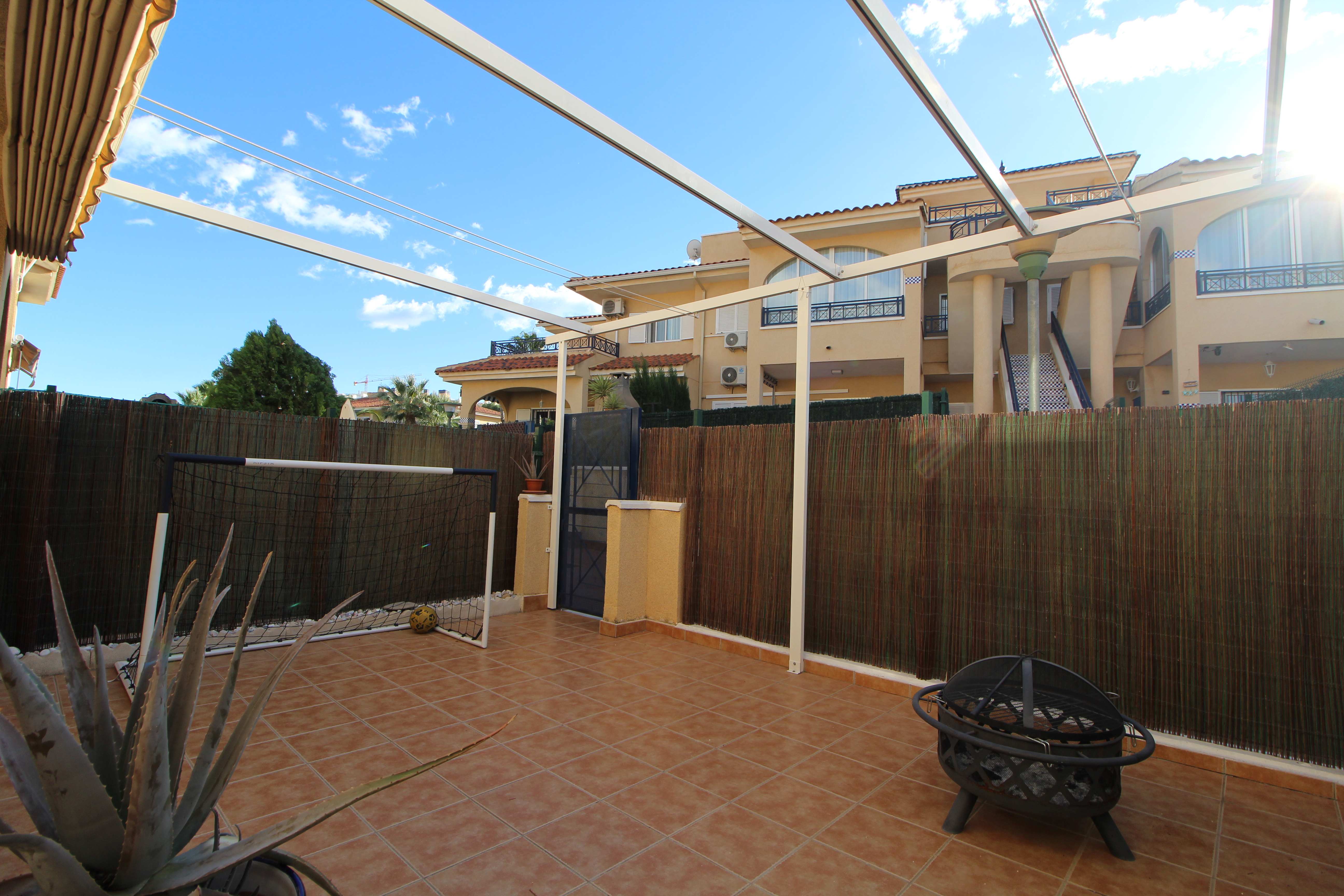 We present to you this south facing Duplex located in a gated community with communal swimming pool and very close to the local elementary school. As you walk in to the property you have a large terrace with a covered porch and an awning, ideal to bring shade during the hot summer days. In the inside you will find on the ground floor, living / dining area next to the partially opened kitchen. Next to the kitchen you will find a laundry area. There is also a storage unit and a full bathroom with shower on this floor. The living room as an AC unit. On the first floor, you have 2 bedrooms, both with built in wardrobe. The main bedroom has an AC and sliding doors that take you out to the balcony. The second bedrooms has a fan. Both bedrooms are on the front of the property which allows them to get sun all day long. There is also a full bathroom with a shower and bidet. The property is sold partially furnished and all white goods. The location is perfect, 2 minute walk from restaurants and bars, 20 minute walk or 2 minute drive from the Carabassi beach, across the road from the bus stop.