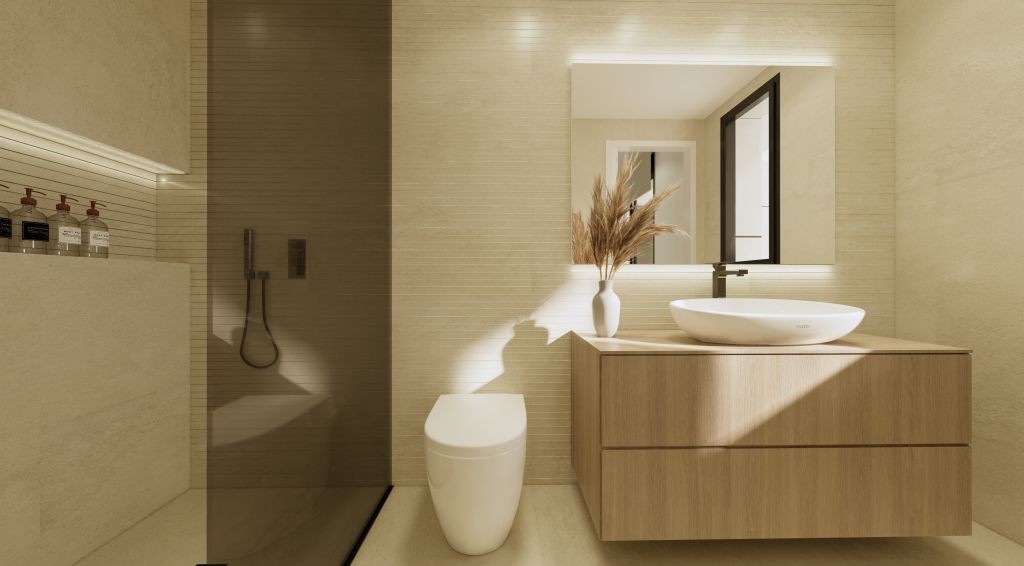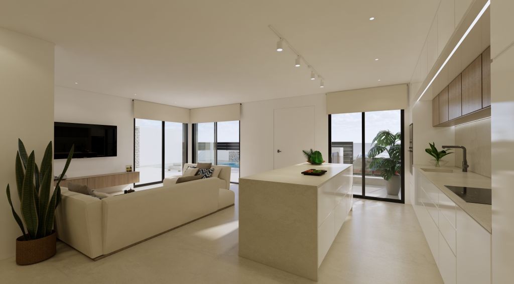 On the ground floor, the homes feature a bright open-plan kitchen seamlessly connected to the living and dining area. Large sliding glass doors open onto a private terrace and landscaped garden with your own swimming pool, creating a perfect indoor–outdoor living experience. This level also includes: